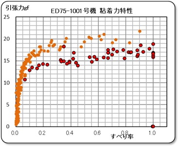 橙色のポイントが過去のデータであり、赤色のポイントが今回のデータである。また、右下のポイントは牽引糸を緩めてロードセルに力が掛からないようして測定したゼロ点であり、引張力のドリフト値のチェックとしている。