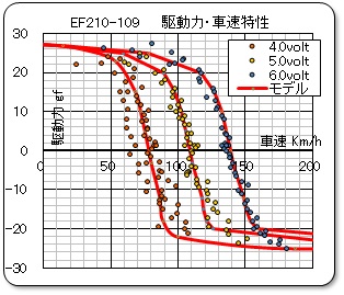 関連報告書「TOMIX製 EF210-109号機の動力特性の解析」(2018/9/1)からの抜粋です。下記の動力特性の測定その3のデータをもとにして、「抗力係数に注目して解析する」にて報告した方法で解析した結果です。