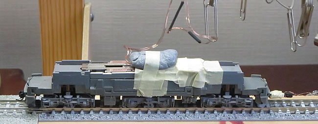 ● 測定に先立ち、手製のカーボン・グリスを集電子のピポット部に塗布して実験を実施した。 これは、ピポット軸受部での電圧降下量の増加防止を狙ったもので、タミヤの接点グリースに、鉛筆の芯(B)をヤスリで削ったカーボンの粉を混ぜたものである。 試験走行では、無事に通電されていたようなので、試験的に実施したものである。