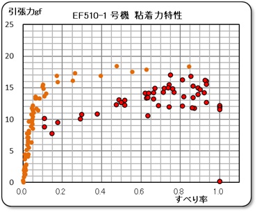 直線線路測定装置を使ってすべり率データの補間のために粘着特性を測定した。