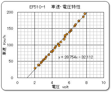 前進と後退は、少しズレてはいるが、構造上から考えてもほぼ同じ特性と判断される。スケール速度80Km/hは、電圧でみると、4.5volt近辺である。同じ電圧では遅い方と思われる。 速度係数は、約 25Km/h/Volt と小さめである。