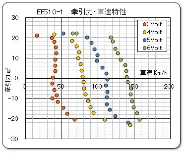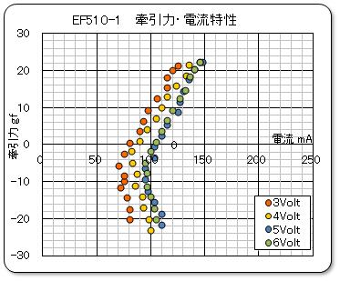 動力車の牽引力特性として、電圧4.5voltでの牽引力・車速特性と牽引力・電圧特性を右に示す。 最大負荷に対しては、速度は半減しているので、上り坂等でのスピードや減速気味かと思われる。 牽引力は 25 gr 程度でELとしては標準的な値である。