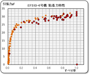 橙色のポイントが過去のデータであり、赤色のポイントが今回のデータである。また、右下のポイントは牽引糸を緩めてロードセルに力が掛からないようして測定したゼロ点であり、引張力のドリフト値のチェックとしている。