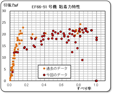 測定結果を右のグラフに示します。過去のデータをやや補完しているようですが、トラクションゴムが少し劣化しているかもしれません。そして特性はやや右上がりの状態を示しています。