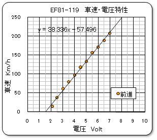 動力車の速度特性として、速度・電圧特性と電流・電圧特性を右に示す。 電圧 4.0 Volt でスケール速度は 100Km/h とNゲージでの標準的な値に設定されている。