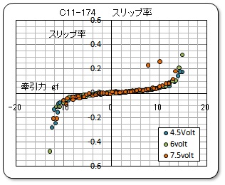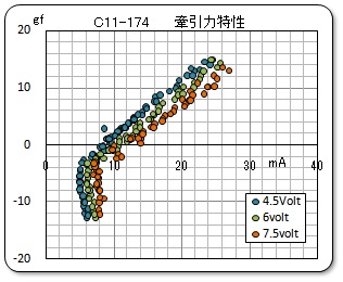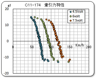 有線式8字走行試験装置にて測定する。測定実施日:2018/6/15 測定状況と詳細のデータは、KATO製 C11-174号機の動力特性 (2018/6/17)を参照のこと。