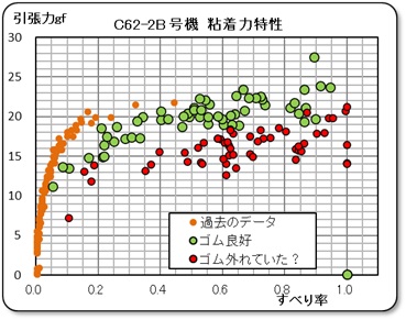 ゴムが良好な状態では、以前のデータを補間していると見ることが出来ます。また、滑走領域では、バラツキが大きいものの、ほぼ一定の値であることが分かります。でも、やや上昇気味のようにも見えますね。 ( 2025/10/13 追記 )