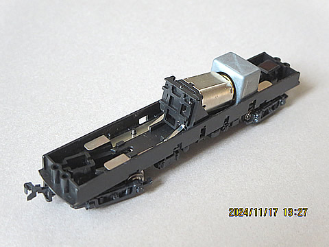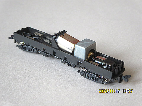 この動力台車の荷重配分は、重り部品が動力台車側に配置されているので、車両重量の約34グラムのうち、その2/3を駆動用台車に配分し、牽引力を約5グラムと大きくしているのだ。