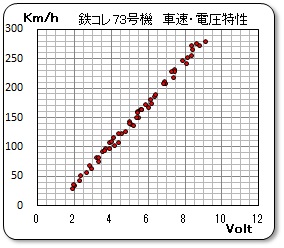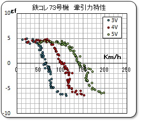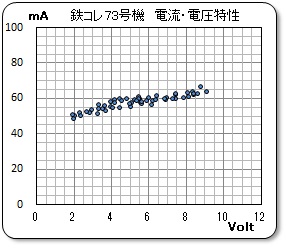 室内灯や前照灯などの電飾を実施していないので、電圧による消費電流の値は殆ど同じである。また、動力機構の遷移点は明確に表れており、マイナス2グラムと妥当な値を示している。