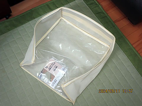 さて、このような工作をわざわざ実施した結果は、どうだったのでしょうか? その答えは下左の写真に示すビニール袋です。 46×42×14cm の大きさで、上面とひとつの側面が透明な袋です。 そして、上面はチャックによって閉じることが出来ます。 これは写真にも写っている書斎に敷いているカーペットの保管用袋なのです。 物待ちの良い小生は、廃棄せずに残しておいたものなのです。 そして、ターンテーブルユニットを収納した状態を下右に示しまず。