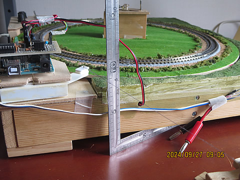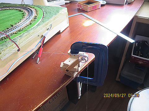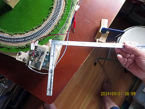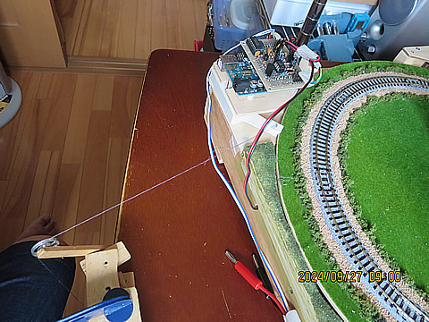 次に、プラス側(駆動側)の較正を実施します。方法はマイナス側と同じですが、こちら側に絹糸を引っ張る場合、新設したモータ駆動のためのパネルが邪魔となっています。そこで、このパネルを一時取り外してセットしました。下右の写真。
