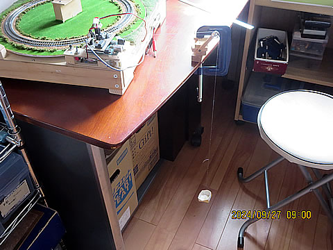そして、絹糸を掛けて重りを乗せる籠をつるします。