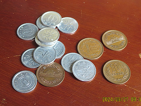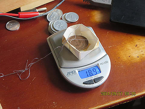 つぎに、1円玉と10円玉を用意します。1円玉は殆どが 1.0 グラムであり、10円玉は 4.5 グラムです。測定時には、籠ごとはかりの上にのせて重さを計測します。