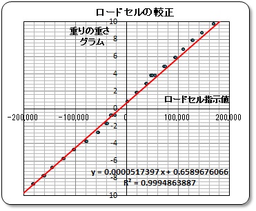 所謂、計測器のドリフト現象が発生していると言えるでしょう。それも値の小さい領域ではその影響が大きいと判断されます。この較正値を値と実際の重りのおもささとの誤差を計算してグラフにしたのが右のグラフです。赤いプロット点が以前の較正値で、緑のプロット点が今回の較正値の場合です。