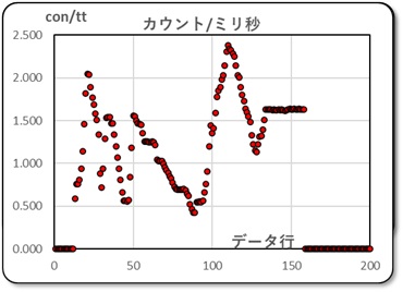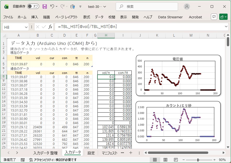 いろいろ失敗を重ねましたが、試しにデータを受信してみました。データの間隔は 150 ミリ秒に、データ行は200 行にし、データの並び順は最新データが先頭に来るように設定しています。また、送信されてきたデータを元にして、 vol/n と con/tt の計算を欄外にて実施させ、その値をグラフとして表示するようにしておきました。