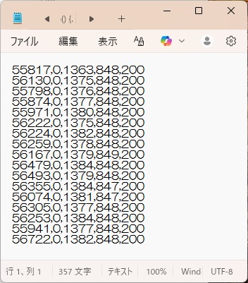 試しに、シリアルモニタによって送信されてくるデータを確認しました。メモ帳にコピー/ペーストされた状態を下に示します。