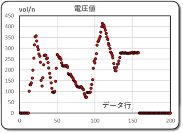 よく見ていると、電圧値の値とカウント値の値の変化が同期しているように見えます。そこで、このデータをX軸とY軸にしてグラフ化してみました。データのバラツキがどの程度なのかを見るためです。下左のグラフです。