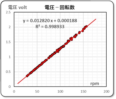 そこで、この変数を実際求める電圧の値と出力軸の回転数に換算してグラフ化したのが右上のグラウです。電圧はアナログポートに直接接続しているので、5volt の値はデジタル値で1023 です。また、出力軸の回転数は、ギヤ比が75.81 、ロータリエンコーダは1回転当たり 12 カウントし、tt はミリ秒ですので、これらの値から換算しました。