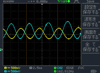 回路の信号を探っていると、センサからの信号は下のオシロ画面のような状態でした。OKですね。