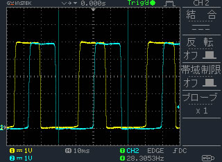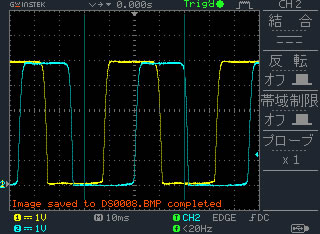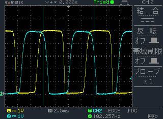 左の画面の状態では波形が少しなまっており、位相位置も不良の状態です。右の画面が最終調整状態です。立上りと立下りのタイミングが均一ではないのですが、パルスをカウントするには充分であると判断しました。