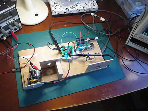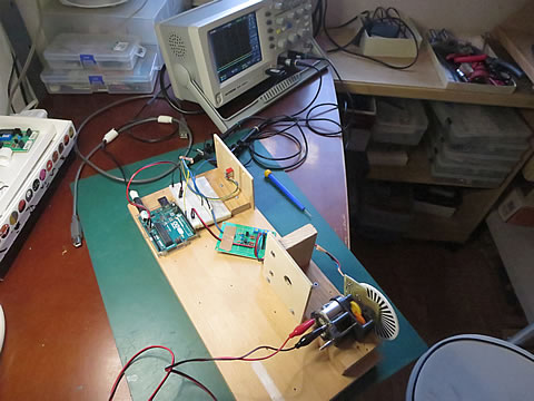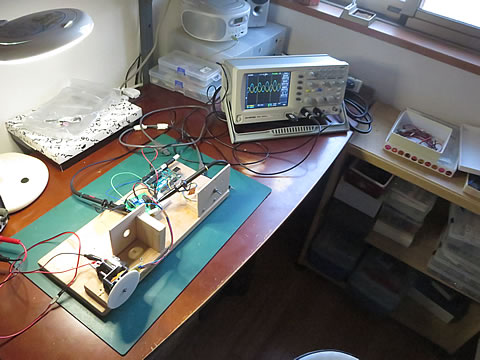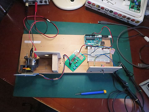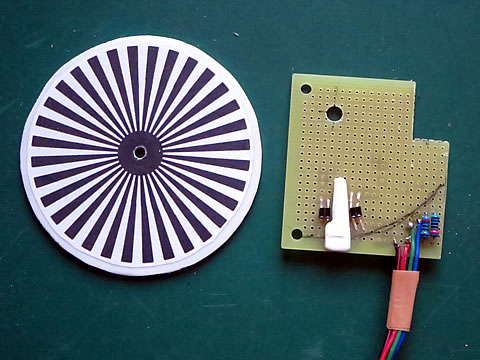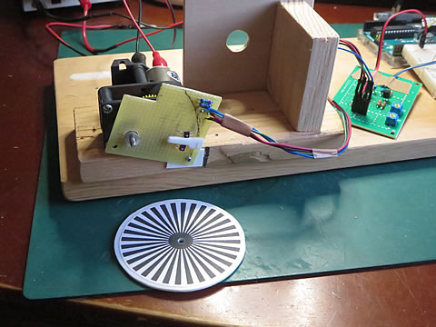 処理回路は、以前工作した回路を使用することにしました。下左の写真です。回転円盤とセンサをモータ付き減速機に取付て、円盤を回転させながらセンサの信号をチェックすることにしました。