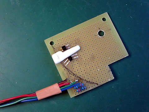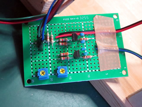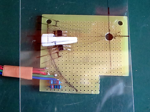 まず、ストック品の中から丁度良い大きさのユニバーサル基盤の切れ端を選び、この上にセンサと回路を取り付けることにしました。