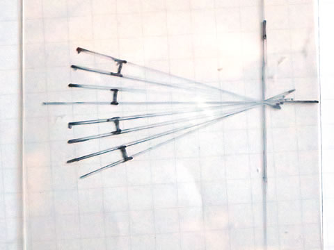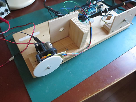 センサの取付位置が重要ですので、透明なプラ板にマジックで線を引き、それに従って取付状態を調整しました。でも写真に示すように、なかなか雑な工作ですが、最終的にはセンサの出力信号を見ながら微調整すれば良いと考えていたので、気楽に工作しています。