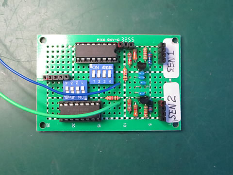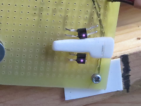 リード線を少なくするために、光源の電流制限用抵抗 220Ωは回路中に取り付けており、リード線は電源用と出力線の4本だけにしました。二つのセンサの間は、光の干渉を避けるために土手を後から追加したのですが効果は不明です。最終的に乱反射防止のために黒塗りにしようと考えています。