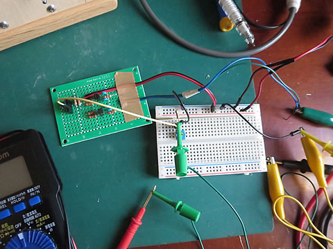 入力信号は正常ですが、出力側はダンマリなのです。そして、使用した処理回路が不良であると早とちりして、新しく作ってしまいました。下左の写真。これならOK のはずと思いきや、やはりこれも駄目でした。