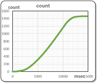 まず、スタートと終了の間だけのデータを切り出して、ゼロ点を修整しておく。そして、パルスカウントのデータである count の値の差分を計算し冂ount とする。このデータはバラツキが多いので、前後の9個のデータの平均を取る事にした。