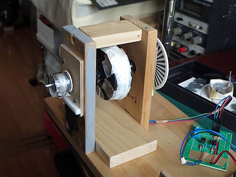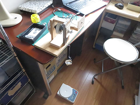 実験方法を単縦化し、慣性体が回転を始めることが出来る力を求めることにした。その方法は、回転体を静止状態にしておき、回転を始める時の重さを測るのである。この時に、静摩擦と動摩擦の境界があるので厳密には測定できないのであるが、ボールベアリングで軸支しているのはその差は小さいとみており、おおよその値は測定出来た。