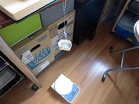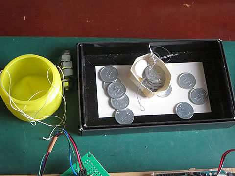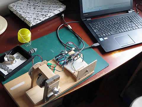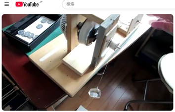 まず、実験装置を紹介する。といっても、今までの装置において重りを載せる籠を、紙製の軽い籠を使用し、重りは1円玉を使った。籠だけの場合は円盤は動きません。そこで1円玉をひとつづつ籠の中に入れてゆき、円盤が動き始める様子を観察した。