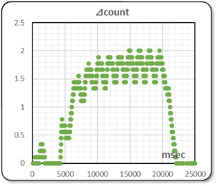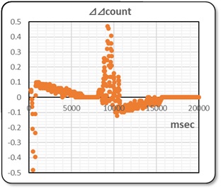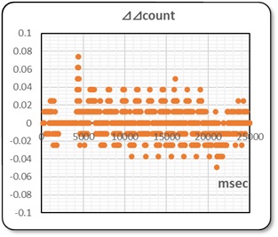 左のグラフに示すcount値 は累積パルス数なので、回転位置を示しています。中央のグラフは、その差分を取った冂ount を求め、その前後の9個の値の平均値を示しています。これは回転速度を示しているので、状態の変化具合を見ることが出来ます。この冂ount平均の値について、さらにその差分を取って同じような処理を実施してみました。上の右のグラフです。