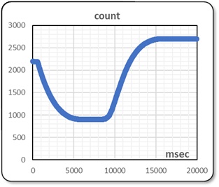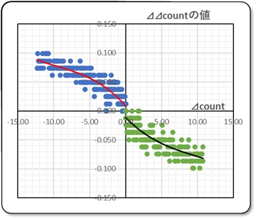 そこで、減衰状態を明示する 刧冂ount と、その位置を明示する count 状態のグラフを重ね合わせ、対象ゾーンの位置を特定することにした。この場合、速度の変化よりも加速度の変化の方が判別しやすいのです。