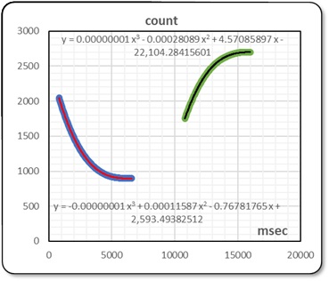 データは綺麗な模様を呈していますが、試しに近似式を当てはめてみました。直線的に変化している様子でもあり、速度の低い部分が曲線的に変化している様にもみえます。試しに、3次式の近似式を適応していました。その様子をグラフ上に表示させましたが、なんだかピッタリですね。