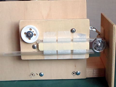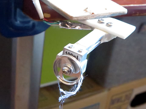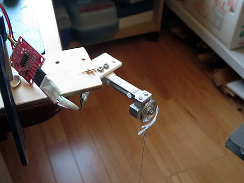 今回、測定側はいろいろ工夫した。その理由は、糸の外れ対策である。牽引時は糸が緊張している状態なので問題ないのであるが。停車時とか、回転体だけが回っている場合は糸が緩むので、滑車の溝から糸が外れてしまうのである。このため、透明パイプを使って糸のチャネルを作っておき、緩んだ時の糸を拘束するようにしている。