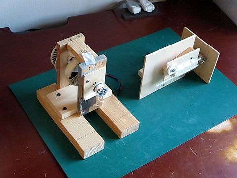 そして、やっとその目途が付いてきたので目的とする実験を始めることにした。このための実験装置としては、慣性体ユニットと引張力測定ユニットが必要となったので、その工作から始めた。この二つのユニットの完成体を右の写真に示す。