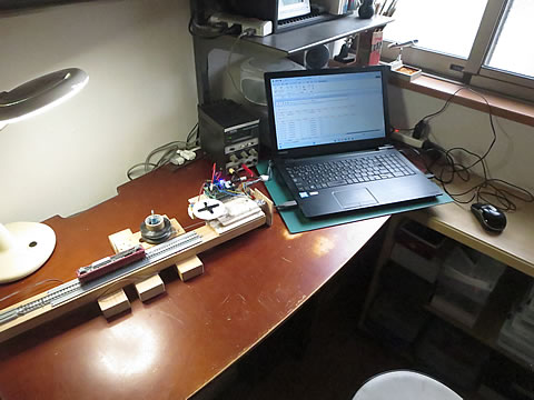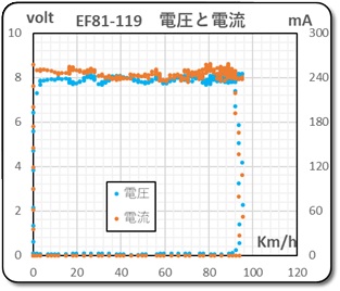 実施したテスト走行の様子を右に示す。電源は、いつもの菊水製の安定化電源を使用し、計測ユニットから送信されてきたデータはパソコンにて記録します。 プログラム等は先回と同じものを使用しました。走行させてモデルは、EF81-119号機です。