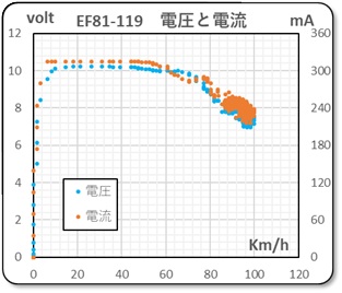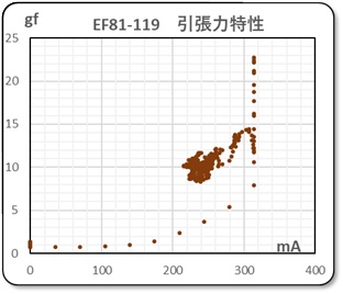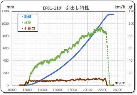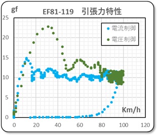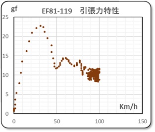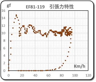 このEF81-119号機の静的特性は、「EF81 119 一般色」(2025/10/14追記)に示しています。その静特性のデータと見比べるのですが、よく分かりません。引張力が10グラム程度と言うことは、このモデルの取って余裕シャクシャクの値なのです。後期高齢者の頭の中では整理できていません。