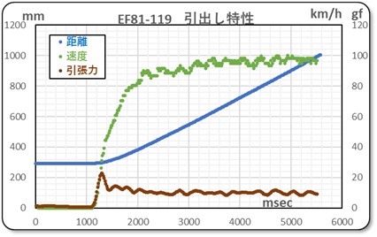 スタート後、1秒も経たないうちにスケール速度 80Km/h に達し、そこからじわじわと速度を速めています。引張力・車速の関係もグラフにしてみました。