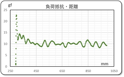 波の幅は2〜3グラムと小さくなっていることが分かります。でも、波の幅が一定していません。糸の進み量は、ロータリエンコーダ部での1回転では 55mm であり、慣性円盤部での1回転では 151mm です。後半は 55mm の幅で波打っているのでエンコーダ部の回転ムラが影響しているようです。