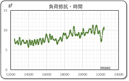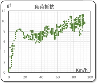 動き始めは少しギクシャクしていましたが、20Km/h を過ぎたあたりから安定した走行となり、徐々に速度を上げた様子が分かります。そして、その時の負荷抵抗値は車速とともに増加しているのが観察されます。