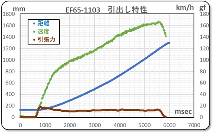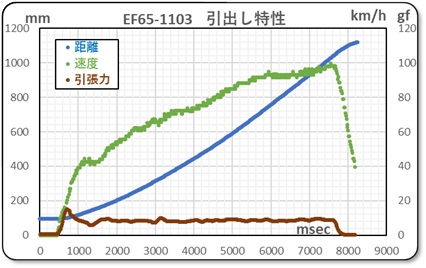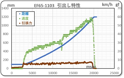 このイラスト図と実験で得られた上記のグラフを比較すると、右に示すA線は列車抵抗に対応し、BとC線が引張力に対応している事が分かります。