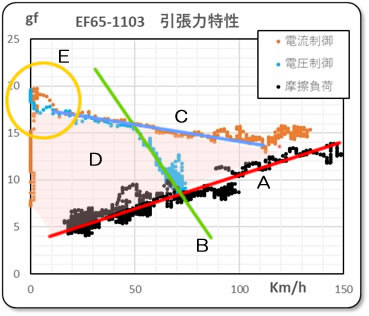 そして、これらに囲まれたゾーンD が加速力を発揮するゾーンとなることも分かります。実際の鉄道車両とはそれぞれの特性線図の形は異なりますが、内容的には対応しています。